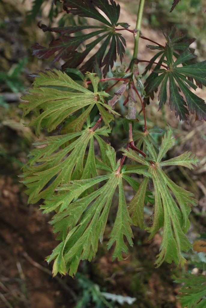 Magnifique petit érable à port étalé et aux grandes feuilles (10 à 15 cm) dentelées et très échancrées rappelant l’aconit, prenant des colorations automnales rouge carmin à pourpre. Préférer les situations fraîches, la mi-ombre. Eviter les sols calcaires.