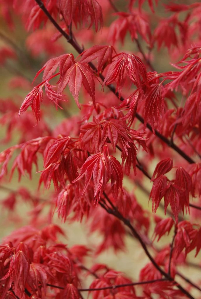 Cultivar d’Acer palmatum ‘Atropurpureum’, rouge vermillon au débourrement, puis vert violacé en été, pour revenir vers le rouge éclatant en automne.