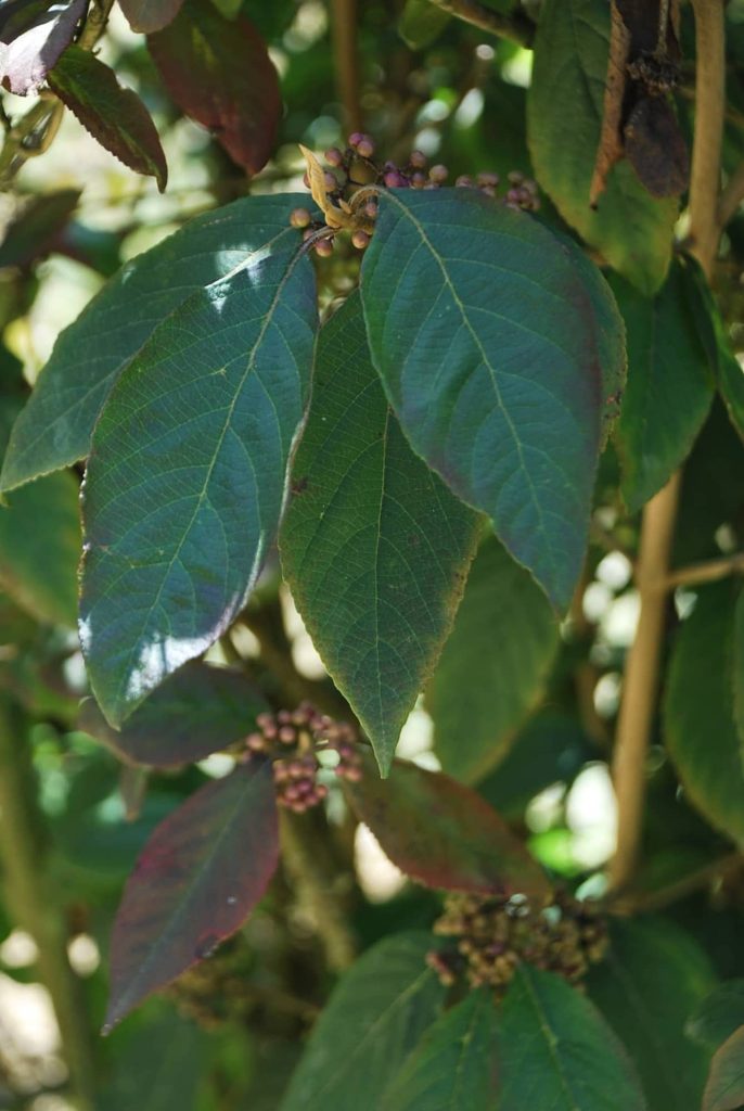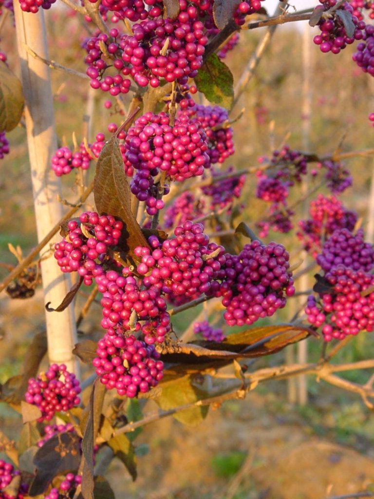 Espèce rustique, sol frais, discrètes fleurs roses en juillet, fruits luisants violacés persistant longtemps l’hiver.