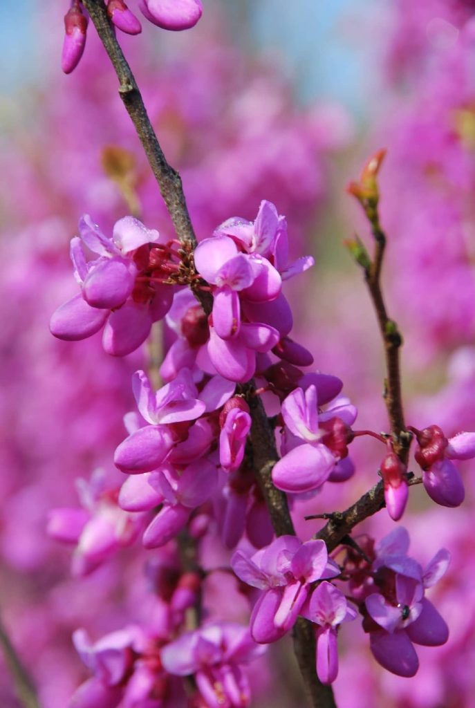 Fleurs rose pourpré sur le bois de deux ans. Il affectionne les situations chaudes et sèches et les sols graveleux et alcalins. Il prend en vieillissant un port souvent pittoresque.