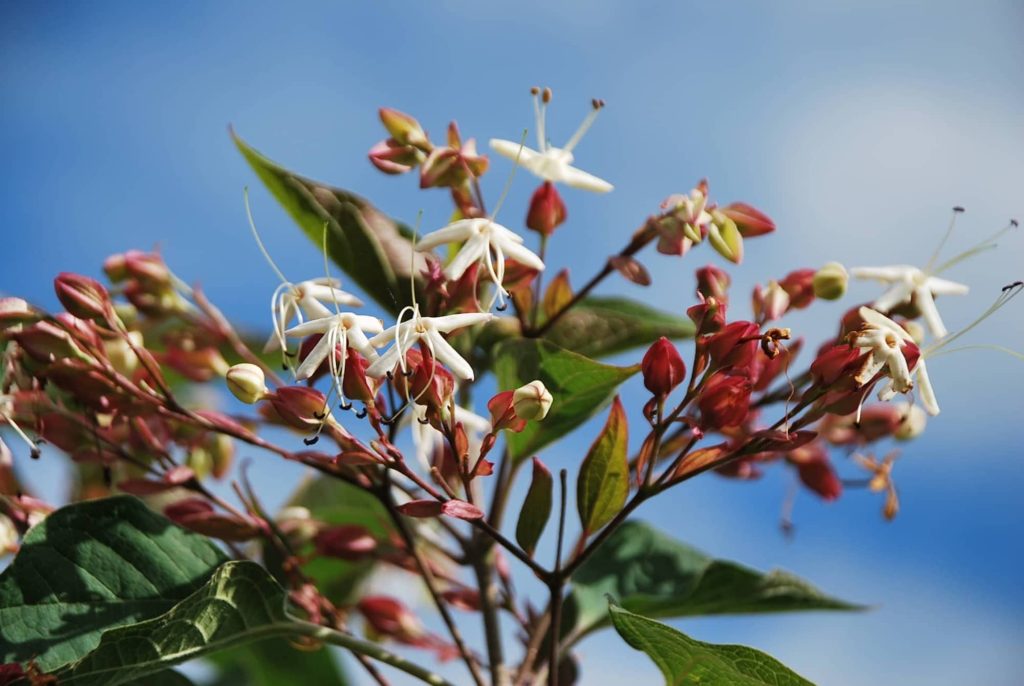 Grand arbuste très décoratif par son port arrondi, ses fleurs odorantes blanches à calice rouge et ses fruits bleus à reflets rouges. Affectionne les hautes températures.