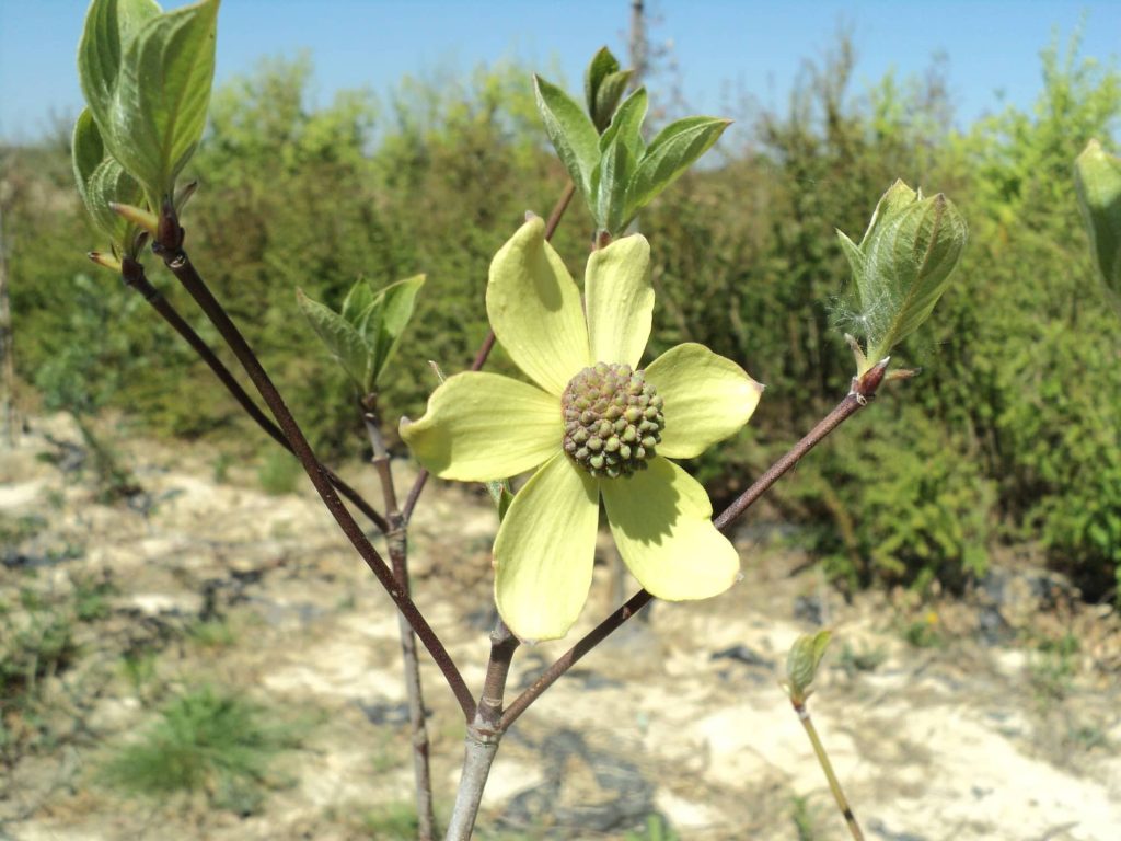 Port dressé, écorce rouge brunâtre, feuille longue et ovale d’un jaune-orangé lumineux à l’automne. Grandes bractées blanches de 10 cm abondantes en mai. Sol riche, frais mais non calcaire. Utilisé en massif.