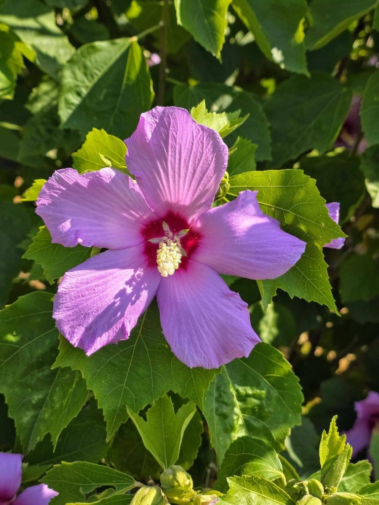 Bel arbuste plus vigoureux que ‘syriacus’. Les feuilles sont également plus grosses, rappelant les Hibiscus exotiques. Floraison généreuse tout l’été avec des grandes fleurs rose-violet au cœur bordeau. Tous types de sols même calcaires, exposition envoleillée.