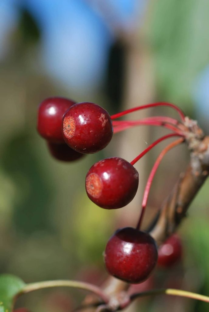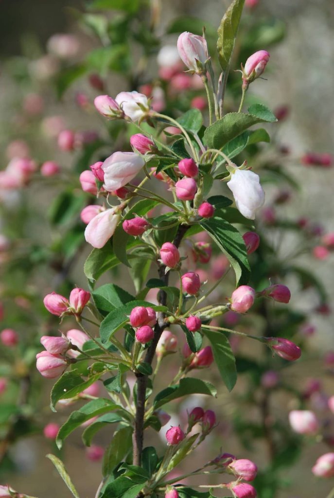 Pommier de grand développement au port semi-érigé. Caractéristique par ses petits fruits rouges, floraison blanche simple.