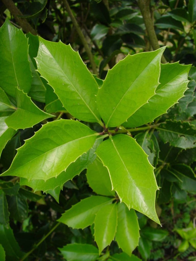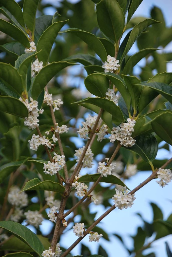Arbuste rustique de taille moyenne au port arrondi dense. Feuilles lancéolées luisantes, épaisses à bords dentés légèrement épineuses (8 à 18 cm de long). Fleurs abondantes très odorantes blanches d’octobre à novembre. Fruits sphériques violet foncé. Tolère le calcaire. Utilisé pour haies, massifs, squares.