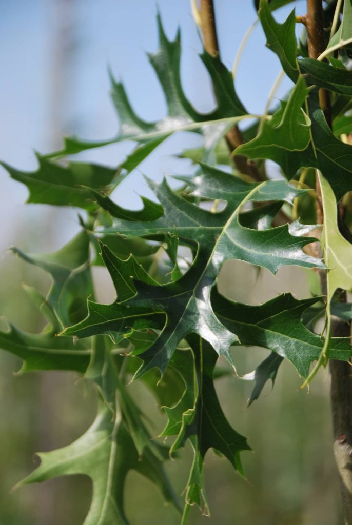 Forme fastigiée, feuille identique au Q. palustris avec une superbe coloration automnale rouge foncé. Aime les sols frais mais ne supporte pas l’excès de calcaire. Employé en alignement et en isolé.