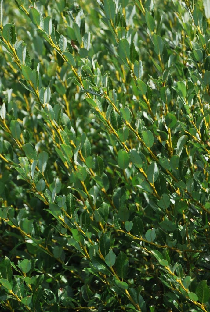 Arbuste touffu aux rameaux tortueux et striés. Feuille ovale ou elliptique au revers bleuâtre.