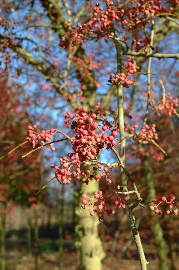 Bonne vigueur. Tous types de sols sauf trop humides. Les troncs sont marqués d’excroissances coniques de 2 à 3 cm, très originales, d’où son nom commun : Clavalier à clous d’Hercule. Feuillage composé vert, jaune en automne. Fleur en ombelle blanche, fruits rouges très décoratifs persistant de 3 à 4 mois, non salissants. Le péricarpe du fruit très aromatique est utilisé comme épice (= poivre du Sichuan ). Emploi : en isolé comme plante de collection originale, en haie défensive infranchissable ou en tige pour petit alignement de faible encombrement.